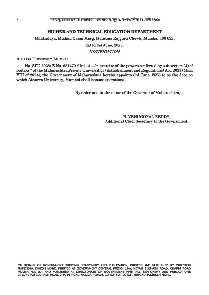 Operational Order of Atharva University Mumbai (Gazette Notification)